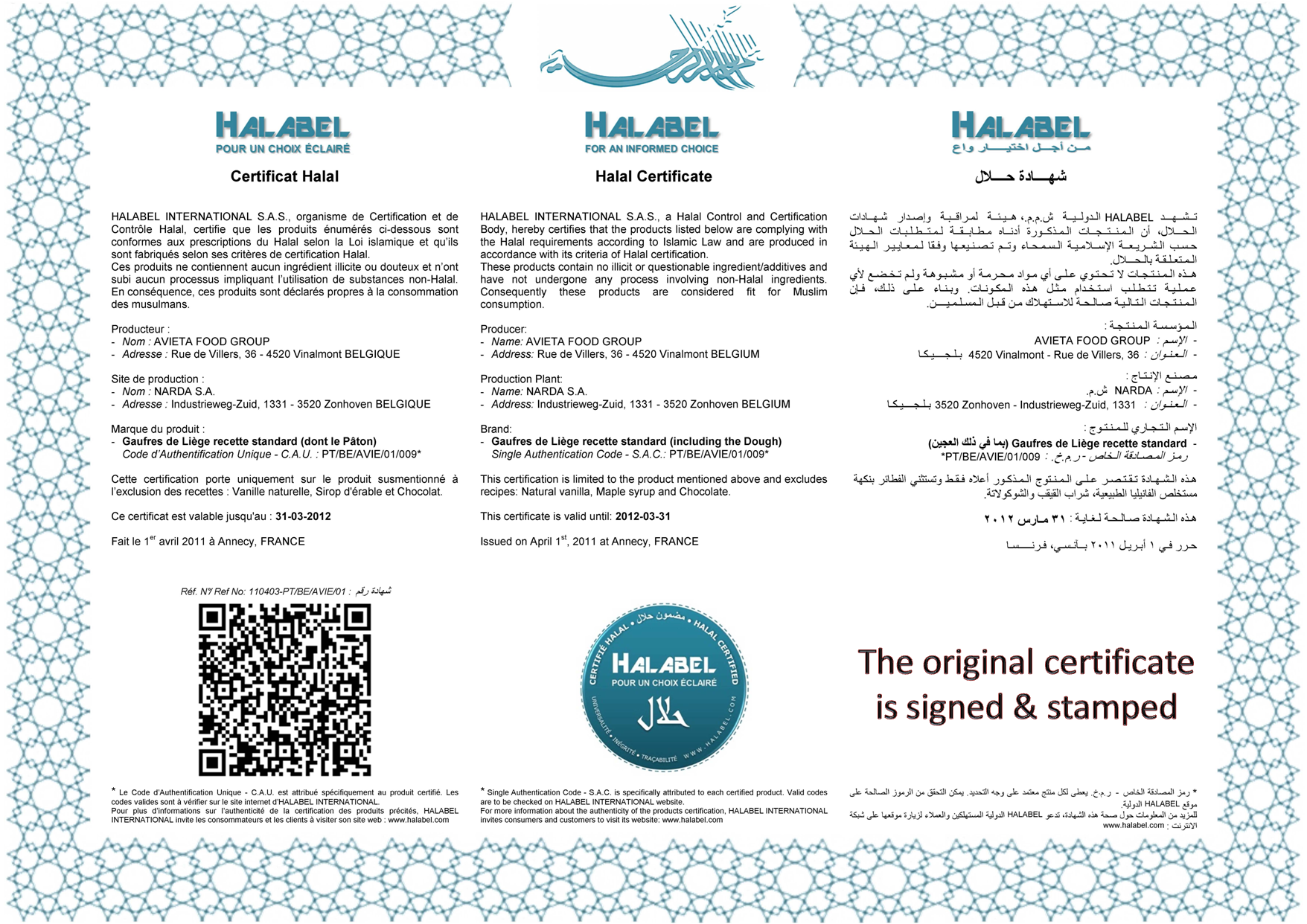 Certificat associé à Narda, délivré par HALABEL INTERNATIONAL SAS :