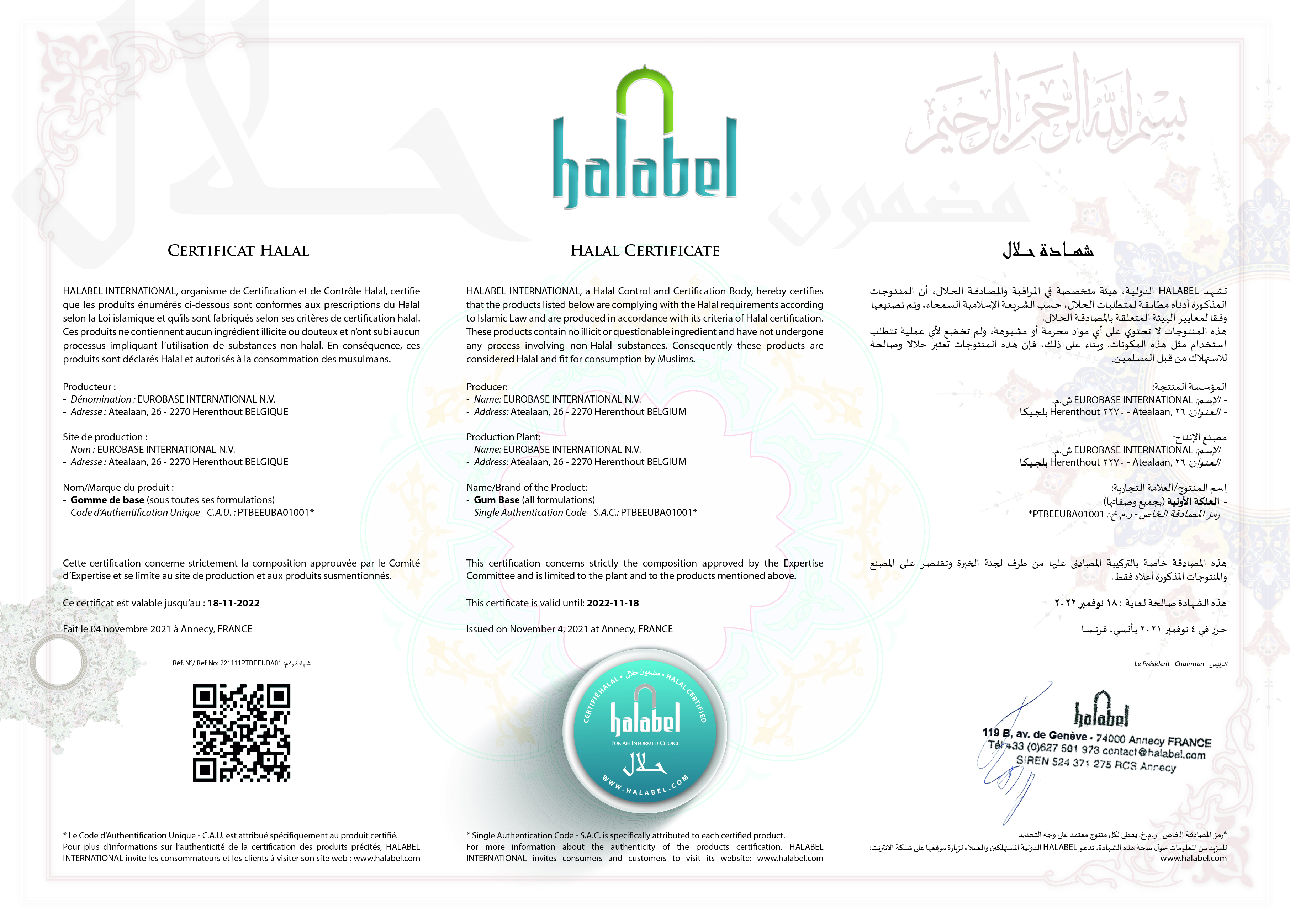 Certificat associé à EUROBASE INTERNATIONAL SA, délivré par HALABEL INTERNATIONAL :